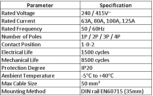 The switch is available in 63A, 80A, 100A, and 125A, allowing selection based on circuit load requirements and panel design.